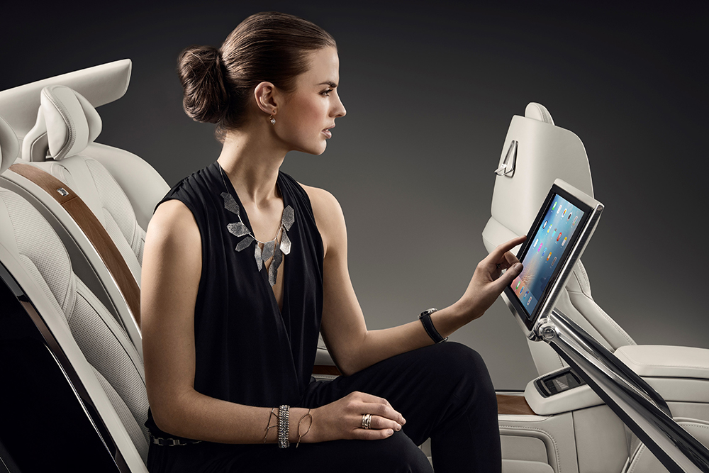 Scaunul pasagerului din față este scos, pentru a aduce un plus de spațiu și a face loc echipamentului suplimentar de lux. Pasagerii au 3 opțiuni de ambient: birou mobil, beneficiind de o măsuță rabatabilă și display supradimensionat, sală de concerte, asistată de sistemul de sunet performant și conectarea la Netflix și cameră de relaxare, unde spătarul banchetei se înclină, paharele reci părăsesc frigiderul, iar suportul încălzit pentru picioare îmbie la destindere.