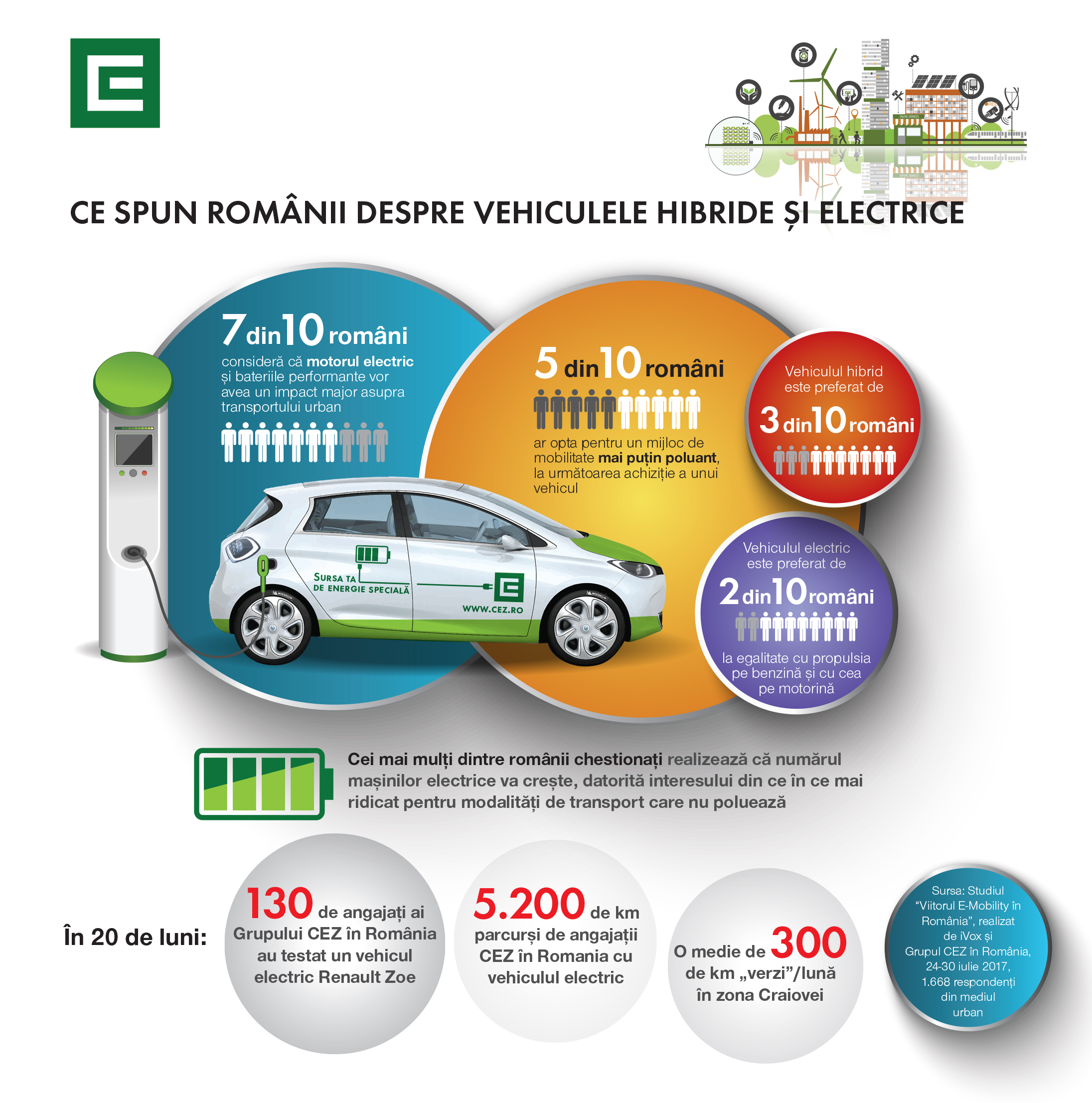 În era în care producătorii auto anunță că vor oferi, în cadrul fiecărei game, și o opțiune electrică, iar autoritățile din Franța și Marea Britanie vor să pună capăt comercializării vehiculelor cu motoare termice, românii sunt pregătiți. 7 din 10 consideră că motorul electric va avea un impact major asupra transportului urbam, iar 4 din 10 sunt convinși că mașinile autonome vor produce shcimbări majore asupra mediului. Un studiu derulat de iVox susținut de CEZ România arată că 5 din 10 repondenți cred că întreținerea unui vehicul electric este mai puțin costisitoare ca întreținerea unuia cu motor termic.