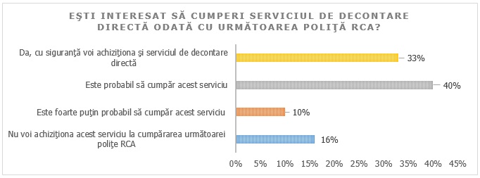 Întrebaţi dacă sunt interesaţi să cumpere această clauză odată cu următoarea poliţă RCA, 33% dintre respondenţi au afirmat că o vor achiziţiona cu siguranţă, în timp ce 40% au precizat că este probabil să cumpere clauza. Pe de altă parte, 16% au declarat că nu vor adăuga şi decontarea directă la viitoarea lor poliţă RCA, iar 10%, că este foarte puţin probabil să facă acest lucru.