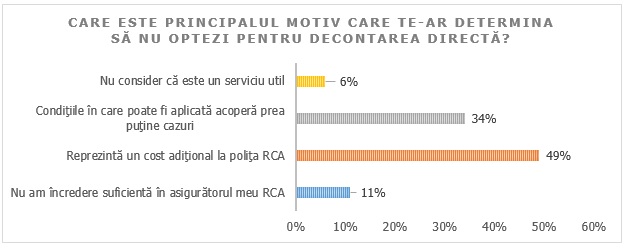 În topul principalelor motive care ar determina un client să nu opteze pentru decontarea directă se află faptul că această clauză „reprezintă un cost adiţional la poliţa RCA”, 49% dintre respondenţi indicând acest motiv.