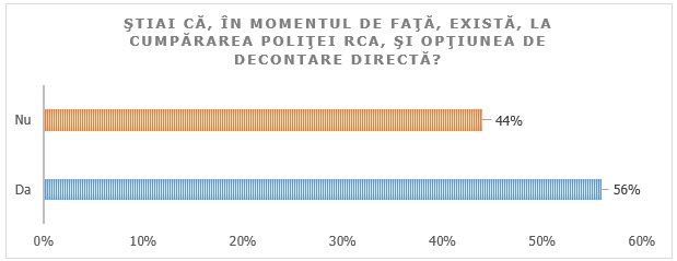 Conform rezultatelor, 56% dintre participanţii la sondaj cunoşteau deja faptul că au posibilitatea să opteze pentru serviciul de decontare directă, la cumpărarea poliţei RCA.