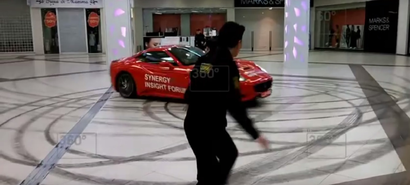 Păzea că vine primarul cu un Ferrari la mall! De fapt, nu la mall, ci în mall! Imaginile înregistrate de camerele de supraveghere ale unui centru comercial din Moscova arată un Ferrari California făcând drifturi și gonind prin fața vitrinelor magazinelor, în timp ce forțele de ordine încearcă, în mod hilar, să-l oprească și, de-a dreptul naiv, punându-și viața în pericol.