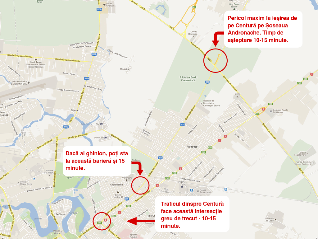 – iesirea din centura catre Andronache este o improvizatie periculoasa, formandu-se o coada de masini pe banda a doua a centurii, perfecta pentru un accident in lant, provocat de vreun tembel grabit; se adauga nesimtitii care evita coada si forteaza din banda intai. In concluzie, 10-15 minute pierdere.
