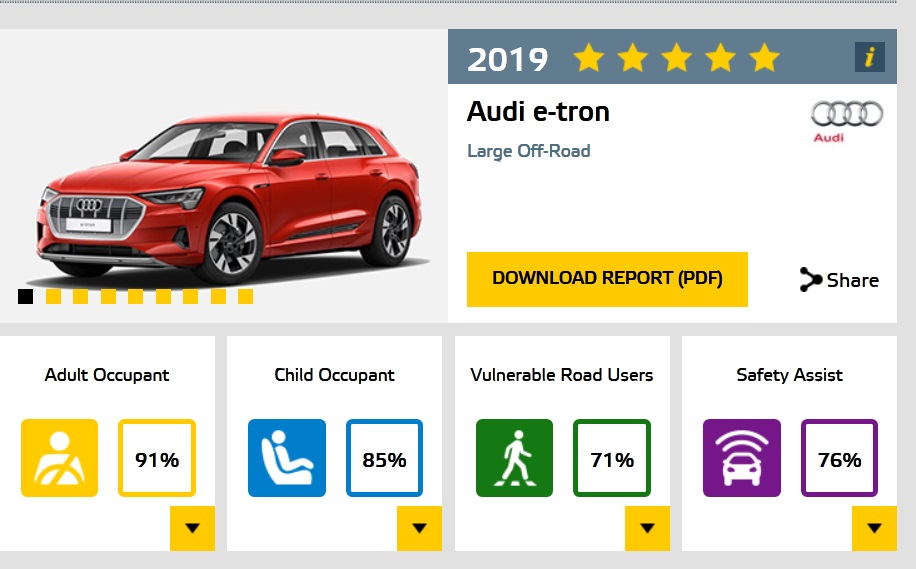 Mașina electrică premium Audi e-tron, venit pe lume în toamna anului trecut, a reușit să obțină tot cinci stele. 91% este scorul trecut în dreptul protecției pasagerilor adulți, 85% pentru pasagerii copii, 71% pentru participanții vulnerabili la trafic și 76% pentru sistemele de asistență ale mașinii disponibile cu camere video în loc de oglinzi retrovizoare.
