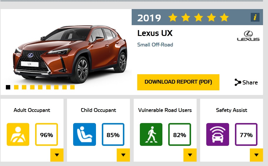 Un alt SUV premium, dar de această dată unul cu propulsie hibrid, Lexus UX, și-a îndeplinit obiectivul la capitolul “siguranță”. Adulții aflați la bord primesc 96% protecție, copiii beneficiază de o protecție cotată la 85%, în timp ce, în caz de impact, protecția asigurată pietonilor și bicicliștilor este de 82%.