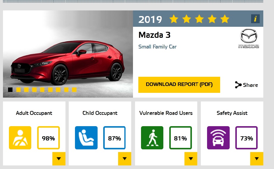 Noua Mazda3, dezvăluită în luna februarie, a obținut cinci stele la testele de siguranță. Compacta cu motor 2.0 pe benzină a obținut un punctaj de 98% pentru protecția pasagerilor adulți, 87% pentru proecția copiilor aflați la bord, 81% pentru cea a participanților vulnerabili la trafic, categorie care include pietonii și bicicliștii. Sistemele de asistență au fost notate cu 73%.