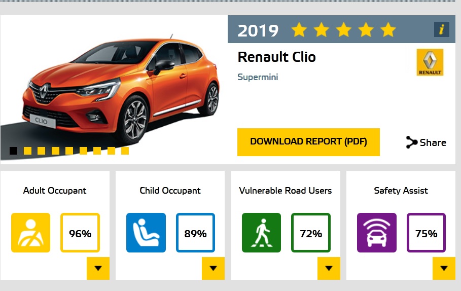 Adusă anul acesta la Geneva, compacta franceză Renault Clio a trecut, de asemenea, cu brio, testele de siguranță. Modelul oferă 96% protecție pasagerilor adulți, 89% copiilor, 72% participanților vulnerabili la trafic, în timp ce sistemele de asistență au fost notate cu un scor de 75%.