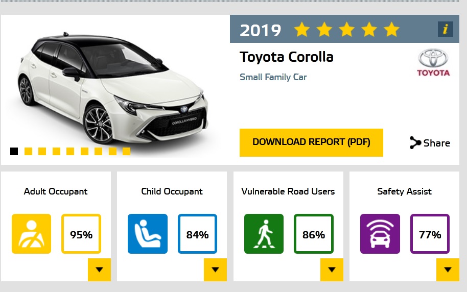 Și Toyota Corolla se bucură de cinci stele la testul EuroNCAP. Autoritățile în domeniu i-au acordat 95% pentru protecția ocupanților adulți, 84% pentru protecția ocupanților copii, 86% pentru protecția altor participanți la trafic, în caz de impact, iar sistemele de siguranță cu care este echipată compacta niponă au fost notate cu 77%.