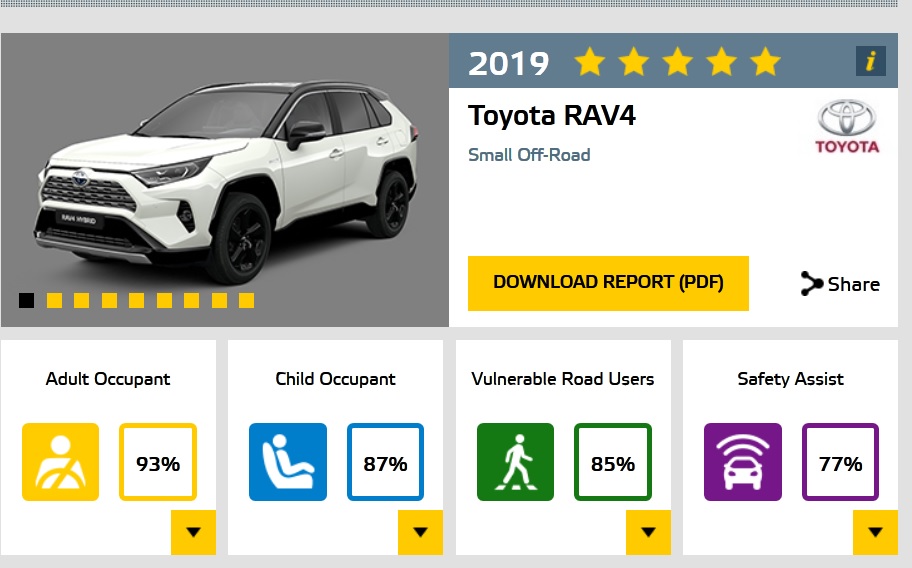 Toyota RAV4, care a fost dezvăluită anul trecut, la Salonul Auto de la New York, a fost notată tot cinci stele, cu 93% pentru pasagerii adulți, 87% pentru pasagerii copii, 85% pentru participanții vulnerabili la trafic și 77% pentru sistemele de asistență.