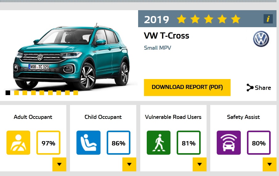 Mezinul familiei de SUV-uri de la Volkswagen, T-Cross, își atrage clienții cu siguranță la nivel maxim. 97%, 86%, 81%, respectiv 80% sunt punctajele obținute de mini-SUV-ul german, testat de curând și de echipa AutoExpert, pentru protecția pasagerilor, protecția copiilor, protecția participanților vulnerabili la trafic și pentru sistemele de asistență.