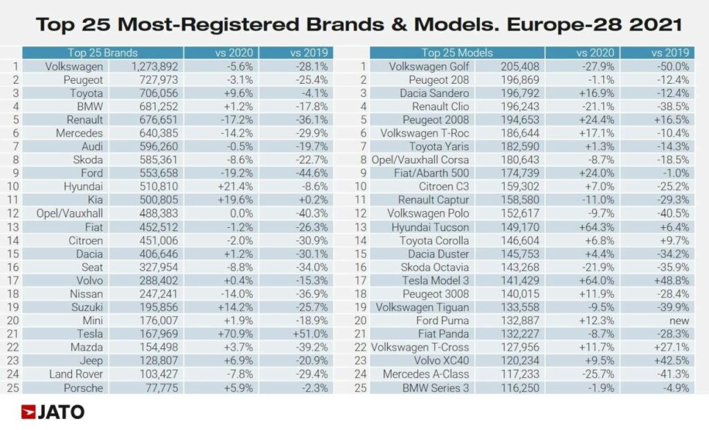 Clasamentul general pe modele a înregistrat anul trecut câteva schimbări semnificative, dar a reconfirmat Volkswagen Golf drept cea mai populară mașină nouă din Europa. Vehiculul compact s-a menținut pe primul loc în ciuda provocărilor majore în ceea ce privește producția și a creșterii concurenței.