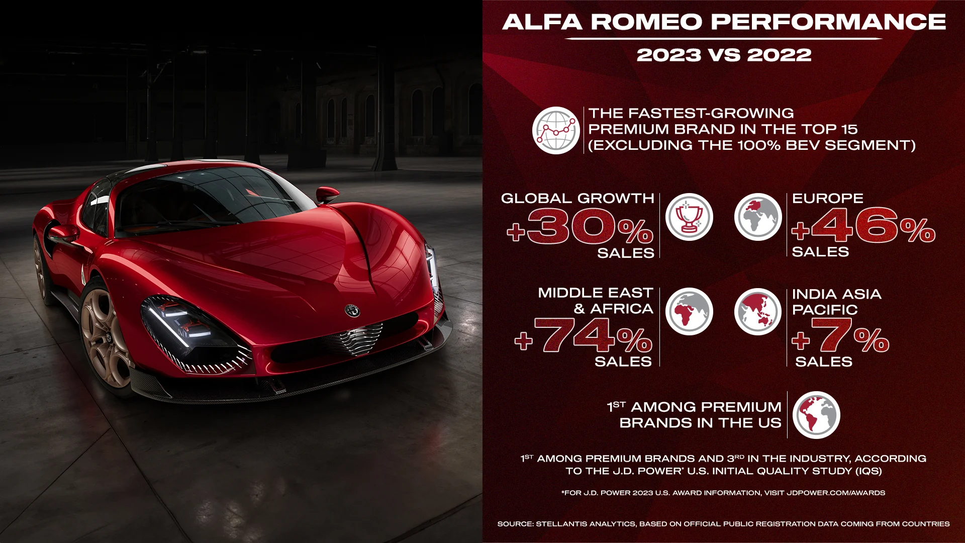 Orientul Mijlociu și Africa rămân regiunea cu cea mai mare creștere, de 74%, susținută de piața turcă, cu +155%. De asemenea, vânzările au crescut cu 7% în regiunea India Asia-Pacific, unde, în 2023, Alfa Romeo și-a consolidat prezența în Singapore și Hong Kong.
