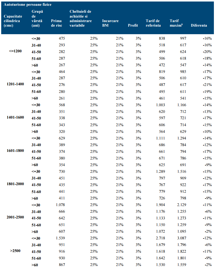 Tariful de referință pentru o poliță RCA încheiată pe un an de zile de persoanele cu vârsta între 31 și 40 de ani, ce dețin un autoturism cu capacitatea cilindrică cuprinsă între 1.201 și 1.400 cmc, este 506 lei, cu 17% sub tariful de primă maxim, stabilit pentru această categorie, de 610 lei.