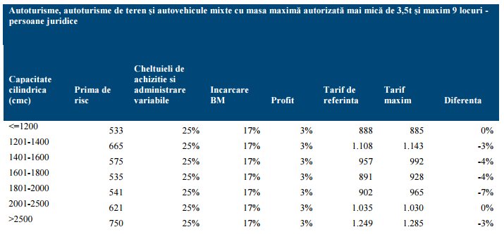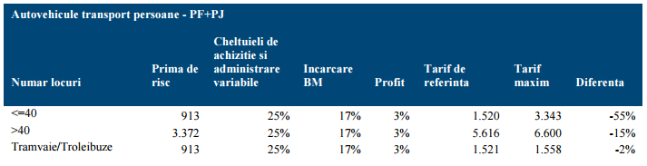 Pentru autovehiculele destinate transportului de persoane deținute atât de persoane fizice, cât și juridice, cu o capacitate mai mare de 40 de locuri, tariful de referință are valoarea de 5.616 lei, cu 15% mai puțin decât tariful de primă maxim care se aplica acestei categorii (6.600 lei).