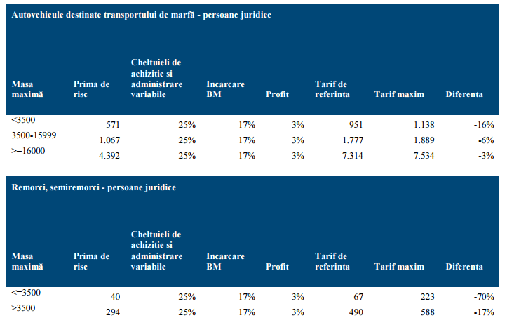 Pentru autovehiculele destinate transportului de marfă (persoane juridice) cu masa de peste 16 tone, tariful de referință este 7.314 lei, mai mic cu 3% față de tariful de primă maxim stabilit pentru această categorie (7.534 lei).