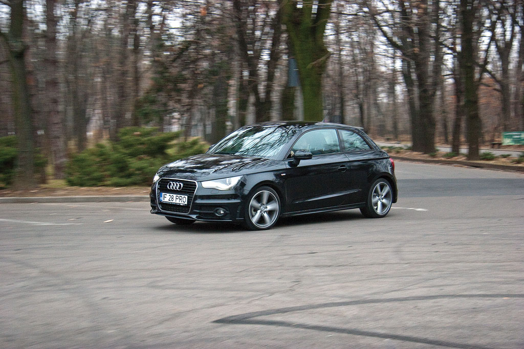 Totuși, salvarea vine din posibilitățile multiple de individualizare a interiorului oferite. Pentru că am avut ocazia să interacționez cu așa ceva, susțin cu tărie că cea mai bună alegere pentru un Audi A1 de 185 CP și transmisie S Tronic ar fi Competition Package, un pachet cu rădăcini în ADN-ul sportiv Audi. La exterior, concurentul din colțul roșu (negru în cazul de față) are aceeași scăpare. Design-ul prea cuminte pentru un automobil cu real potențial. Pachetul S Line garantează o doză de rafinament, în special mulțumită jantelor cu un aspect spectaculos, dar tot nu reușește să întregească tabloul. Cu siguranță, același Competition Package de care aminteam la interior s-ar dovedi o opțiune bifată foarte inspirat de cumpărător.