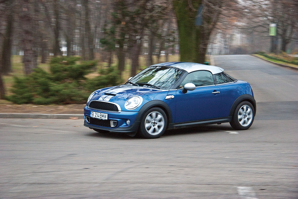 Noul Coupe este încântător din punct de vedere dinamic, fără a se apropia de perfecțiune însă. Ca și în cazul lui A1, valorile relativ scăzute ale ampatamentului și ale ecartamentelor, soluția constructivă cu punte motoare față, cu putere destul de mare (pentru gabaritul de care aminteam) își spun cuvântul când împingi lucrurile spre extrem. Dar, doar acolo, pentru că până atunci, cu mult peste limitele marii majorități a șoferilor, MINI este excelent! Felul în care se încăpățânează să se agațe de șosea, chiar și în cazul echipării cu anvelope de iarnă, este lăudabil și poate creiona zâmbete largi, amplificate generos de adrenalină, pe fețele multora. Vinovat, în mare parte, este trenul de rulare setat vădit spre sportivitate, cu punte independentă spate, dar care prezintă o setare dură a suspensiei. Avantajele bifate pe drumurile solicitante dinamic se transformă în dezavantaje în traficul urban, unde MINI Coupe este dur, ușor inconfortabil și gălăgios la denivelări.