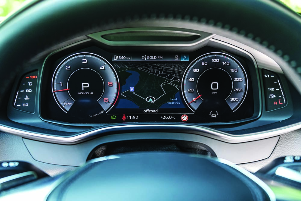 Piesele de rezistență sunt, însă, cele cinci display-uri pe care Audi le-a dispus metodic prin întreg habitaclul. În față, primesc instrumentarul digital Virtual Cockpit de 12,3 inci și rezoluție 1.920×720 pixeli, display-ul tactil de 10,1 inci al sistemului multimedia (ambele formează pachetul MMI +, de 3.763 euro), ecranul tactil de 8 inci destinat sistemului de climatizare și head-up display-ul care proiectează parametrii de rulare pe parbriz. Totodată, pasagerii din spate au la dispoziție un ecran tactil din care pot regla individual parametrii climatizării (la pachet cu sistemul de climatizare cu 4 zone, 906 euro). Adio butoane fizice, bun venit în mediul virtual!