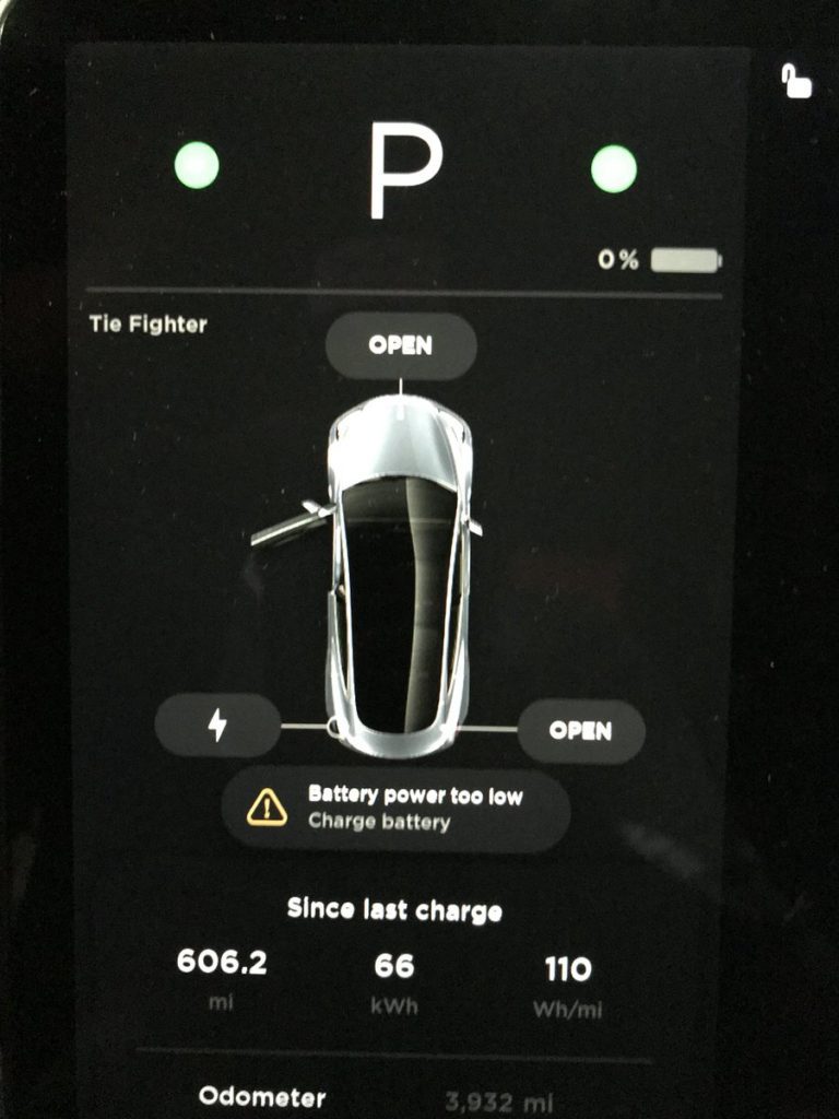 Încercarea curajoasă le-a aparținut unor fani ai brand-ului, Sean Mitchel și Erik Strait din Denver, Colorado, mașina aparținând acestuia din urmă. Cei doi au reușit să călătorească 606,2 mile (975 de kilometri) înainte de a conecta din nou automobilul la o stație de încărcare. Este prima Tesla din lume care trece de 600 de mile.