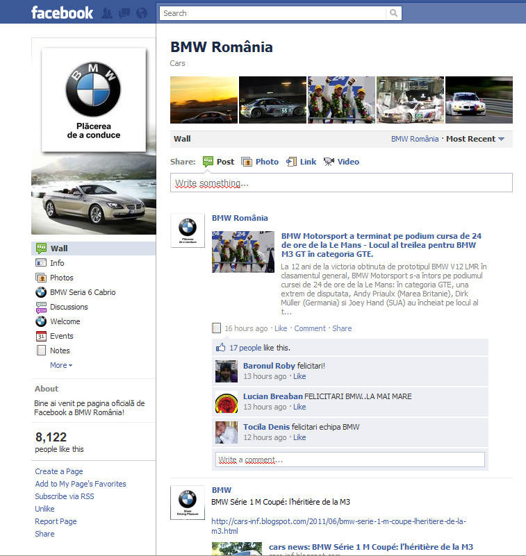 Romania a debutat în primăvara anului trecut şi a înregistrat deja peste 8000 de fani, în timp ce www.facebook.com/MINI.Romania a fost lansată în luna mai a acestui an. Pe perioada verii, pagina de Facebook BMW Romania va susţine o serie de campanii de comunicare prin aplicaţii special dezvoltate – BMW Story of Joy şi BMW Edizzione.