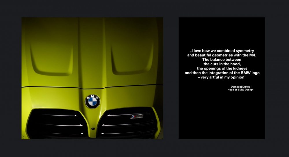 “Îmi place cum am combinat simetria și geometriile frumoase cu M4. Echilibrul dintre tăieturile capotei, deschiderile grilei duble și apoi integrarea logo-ului BMW – foarte ingenios/artistic în opinia mea.”