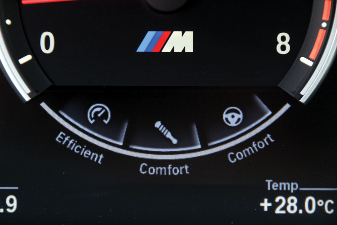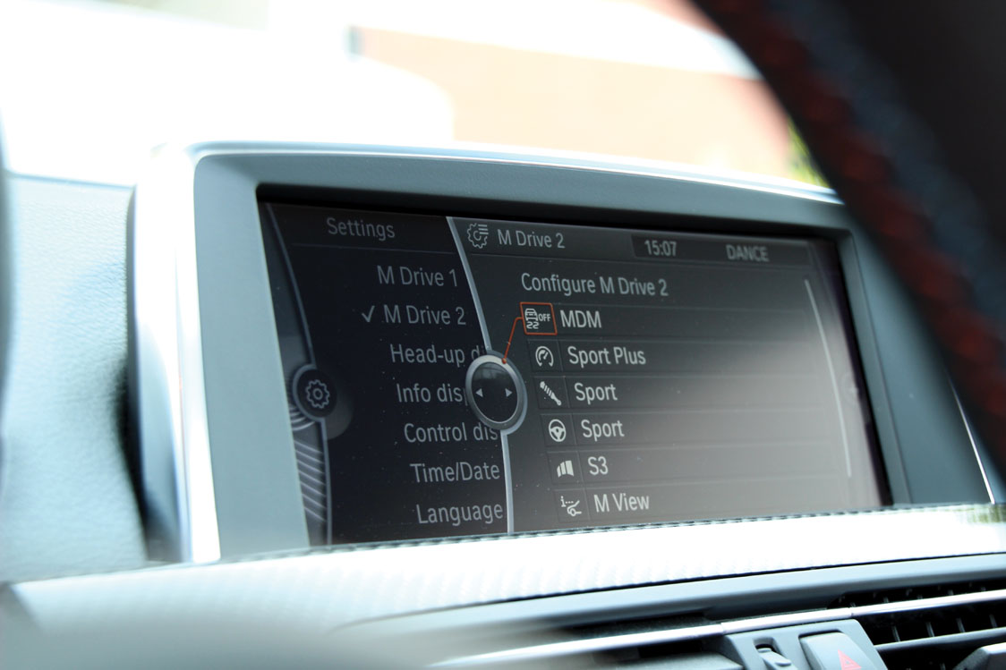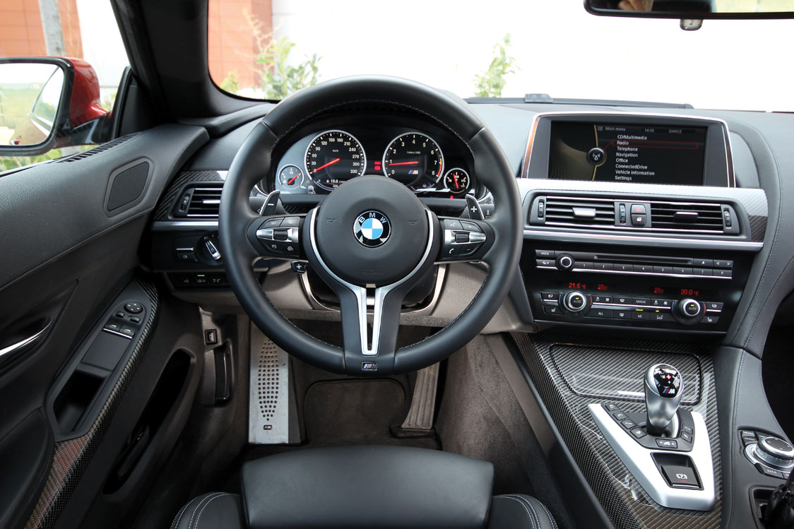Lucrurile cu adevărat interesante se petrec odată ce ajungi la bord. Poziţia de condus joasă, fibră de carbon la tot pasul şi materiale alese pe sprânceană. Patru locuri, cele din faţă veritabile, în timp ce bancheta, deşi poate fi folosită de către persoanele adulte doar ocazional, oferă un confort mai bun decât cea din Jaguar XKR-S sau Porsche 911. Mi-am găsit cu uşurinţă locul la volan, însă îndată ce am încercat să identific extremităţile caroseriei am întâmpinat şi prima problemă. Dimensiunile generoase de la exterior sunt amplificate şi de formele plonjate şi poziţionarea scaunelor cât mai în spate şi mai jos posibil. La viteze mici acest lucru este remediat cu brio de către senzorii de parcare şi camera video pentru mersul înapoi. Situaţia s-a schimbat când mi-am adus aminte pentru ce m-am urcat la volan. M6 porneşte ca din puscă imediat ce apeşi mai hotărât pedala din dreapta, transmisia tună la fiecare schimbare de treaptă, iar şansele să rămâi pe banda ta descresc direct proporţional cu numărul de butoane apăsate. Este totul ON, nicio problemă, anvelopele protestează puţin, însă electronica intervine subtil astfel încât să păstrezi direcţia de deplasare. Cu ajutorul unui meniu stufos îţi poţi configura răspunsul direcţiei, al transmisiei şi al motorului, dar şi modul cum intervin sistemele de asistenţă.