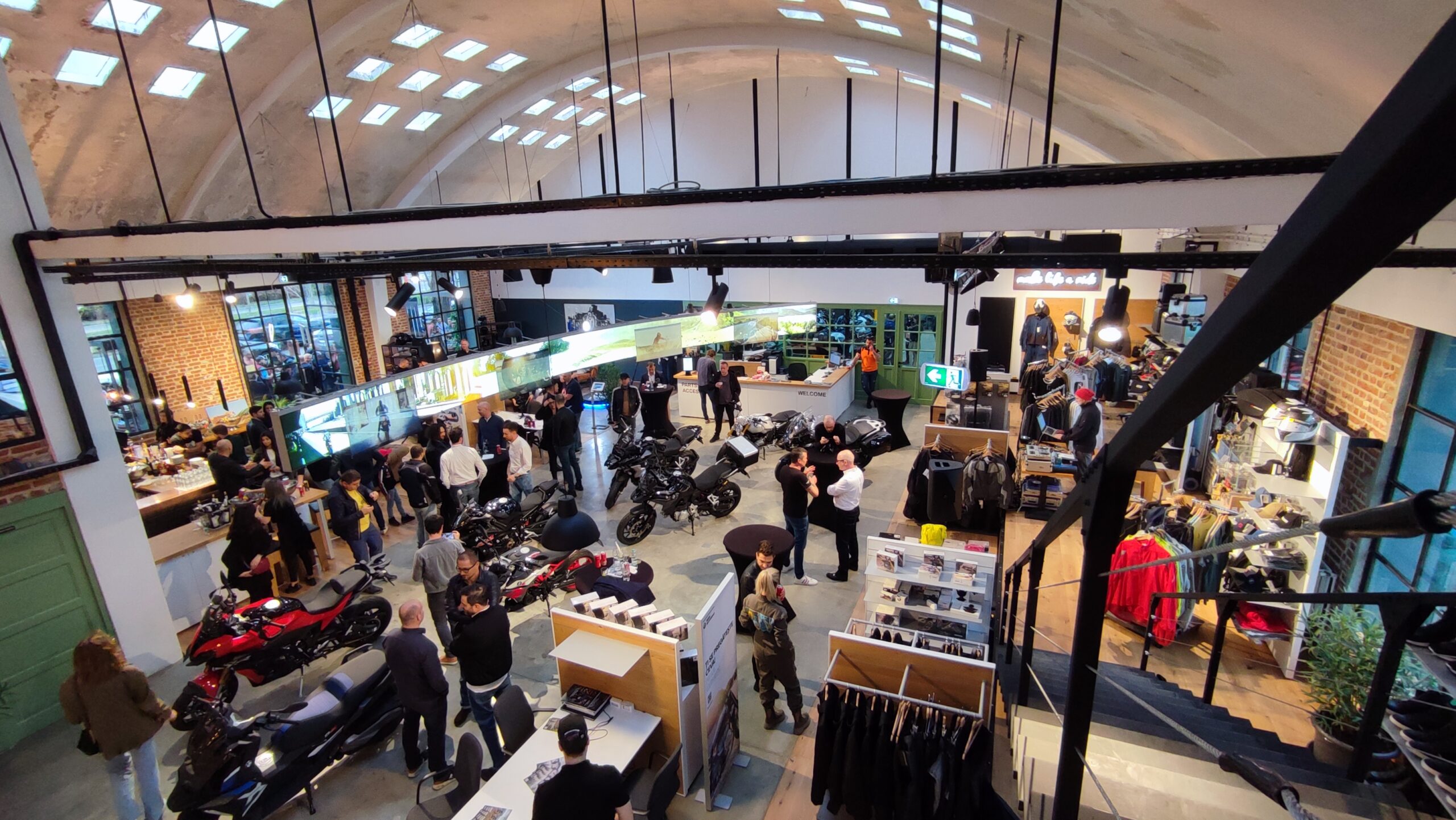 Locul ăsta trezește emoții și dacă-l privești din stradă. E o hală veche, cu istorie lungă în spate, pe care BMW Moto-Hub a recondiționat-o de așa natură încât să nu-și piardă farmecul. De exemplu, ușile halei au fost recondiționate tocmai la Sighișoara. Tavanul curbat, deși pare a avea 100 de ani, a fost curățat și vopsit cu un lac special. Deci nu te teme – deși pare, n-o să-ți scuture în cap tencuială.