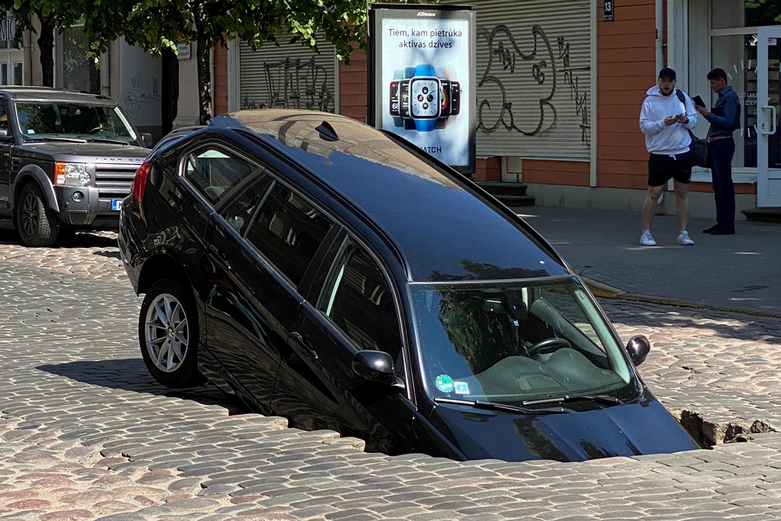Un Mercedes-Benz a reușit să evite gaura apărută, da un BMW Seria 3 E91 nu a fost la fel de norocos și s-a scufundată în crevasa apărută pe strada cu piatră cubică.