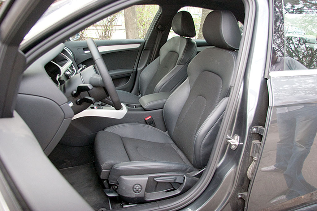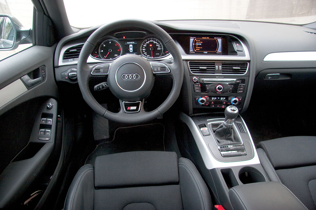 În interior povestea este asemănătoare, A4 avea deja un interior recunoscut pentru calitate și ergonomie așa că inginerii s-au concentrat pe detalii. Pentru amatorii de statistică coloana de direcție a fost redesenată, sistemul MMI Plus și Audi Drive Select au fost simplificate, iar lista de inserții și tapițerii este de două ori mai lungă ca înainte. Rezultatul este un interior reușit cu o tentă evidentă high-tech, ce se vede depășit la capitolul gadget-uri doar de BMW Seria 3, care, a se nota, a avut de partea sa o echipare ultrageneroasă.
