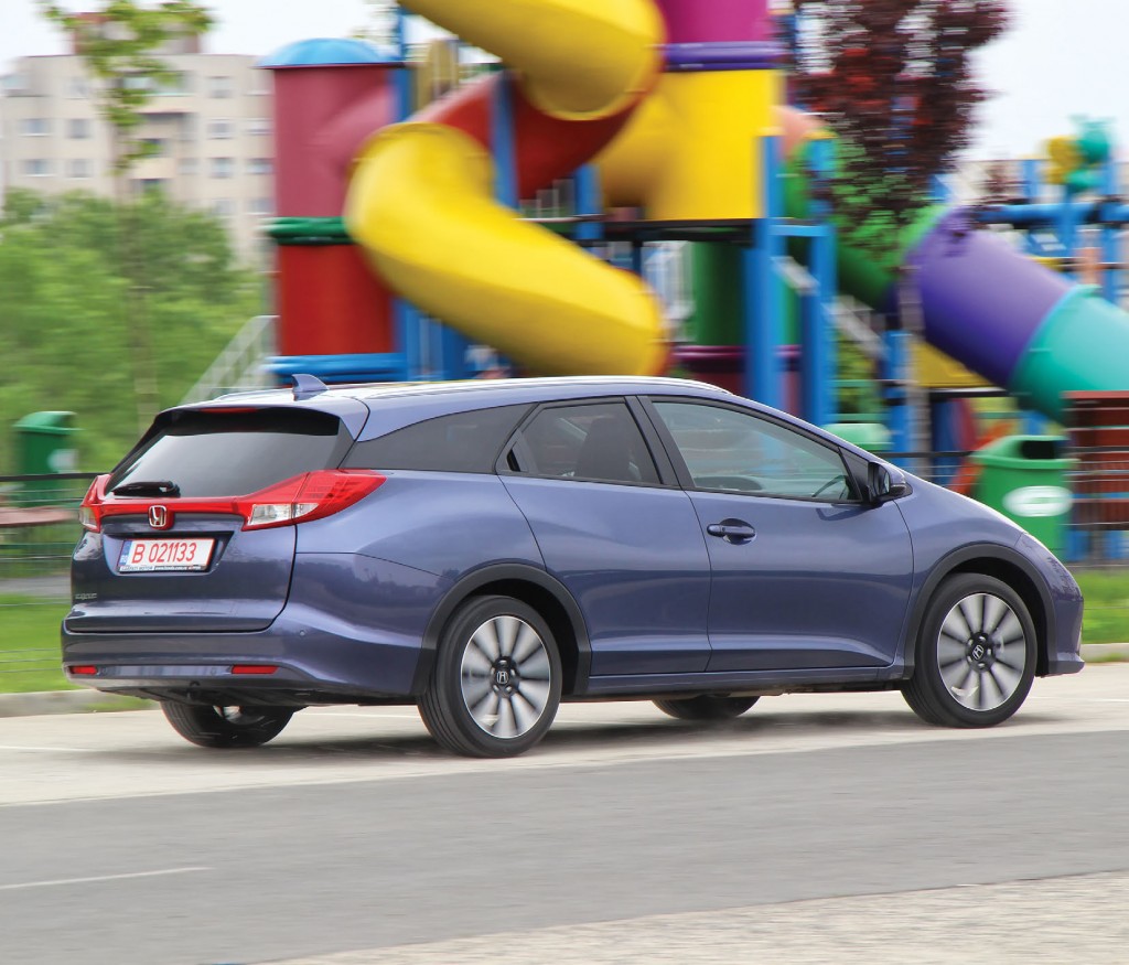 Numele Sport asociat unui motor aspirat pe benzină cu capacitatea de 1.8 litri, nu este, de cele mai multe ori, o soluţie care să ofere încredere. Cu 140 CP și o transmisie cu șase trepte etajată perfect, mașina nu se mișcă însă deloc rău. Motorul trage bine pe o plajă întinsă de turaţii, este silenţios și a dovedit că poate fi capabil de un consum apropiat de cel declarat, lucru posibil ce-i drept, în condiţii de exploatare destul de „eco“. Interesant este consumul urban ce se poate menţine fără probleme sub limita a 10 litri, un rol important avându-l aici sistemul stop-start pe care îl găsesc mai eficient și mai precis în funcţionare comparativ cu cele prezente pe compactele germane nonpremium. Și totuși, sportivitatea la care face referire denumirea mașinii nu are legătură strict cu motorizarea, ci mai degrabă, cu o sumă de aptitudini ce fac din Civic Tourer o mașină mai plăcută de condus decât sunt cele mai multe mașini din acest segment. Contribuţia la această stare o are setarea suspensiei și direcţiei, ce aduc o agilitate foarte bună în condiţiile în care confortul de rulare nu pare a fi deloc afectat. În plus, cel de la volan are posibilitatea de a interveni asupra comportamentului mașinii prin intermediul unui sistem care controlează amortizoarele spate și sistemul de direcţie, oferind trei moduri de lucru: Dynamic, Normal și Comfort. Dezvoltatorii acestui model se pare că au muncit suficient de mult cât să poată scoate pe piaţă un break interesant și suficient de pregătit care să poată pune probleme concurenţei majoritar europene. Argumentele lui Civic Tourer încep cu personalitatea, rafinamentul și caracteristicile dinamice echilibrate, dar și cu un interior la care modularitatea și oferta de spaţiu sunt gata să definească noi standarde în segment.