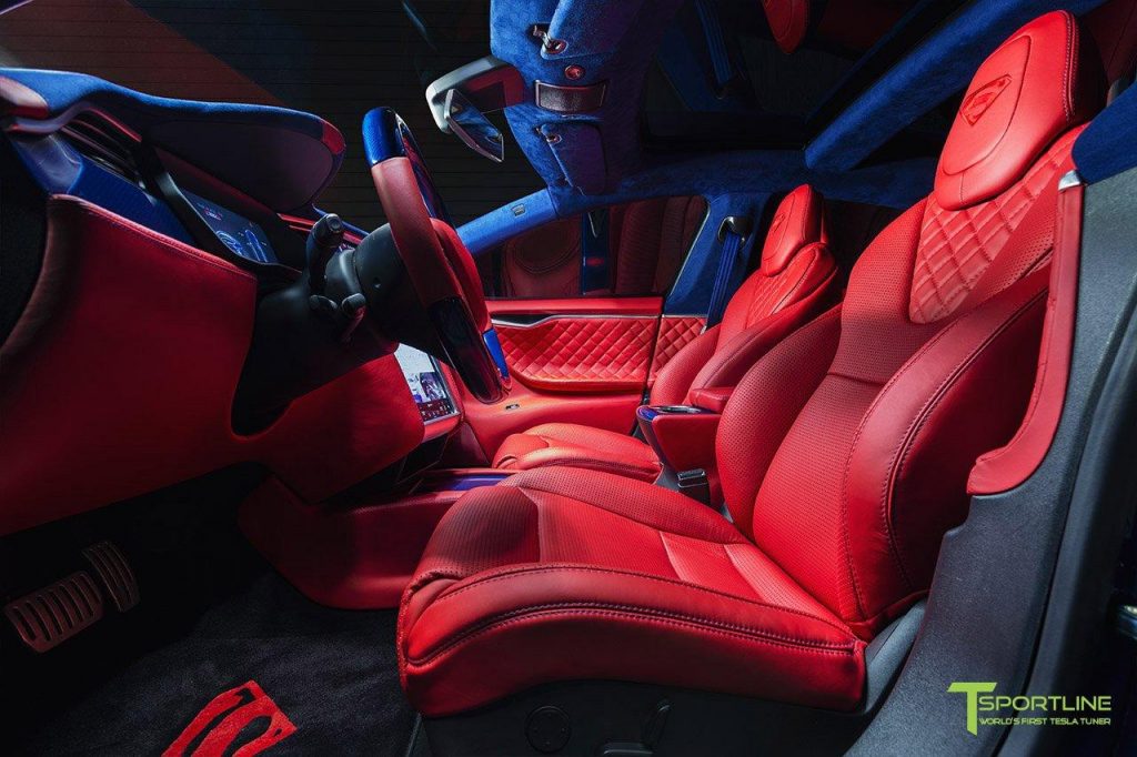 Odată deschise, portierele din față proiectează pe asfalt logo-ul cu litera S. La interior, scaunele și fețele ușilor sunt îmbrăcate în piele roșie, la fel și partea inferioară a bordului, în timp ce sectorul median și cel superior sunt îmbrăcate în albastru lucios și alcantara tot de culoare albastră.