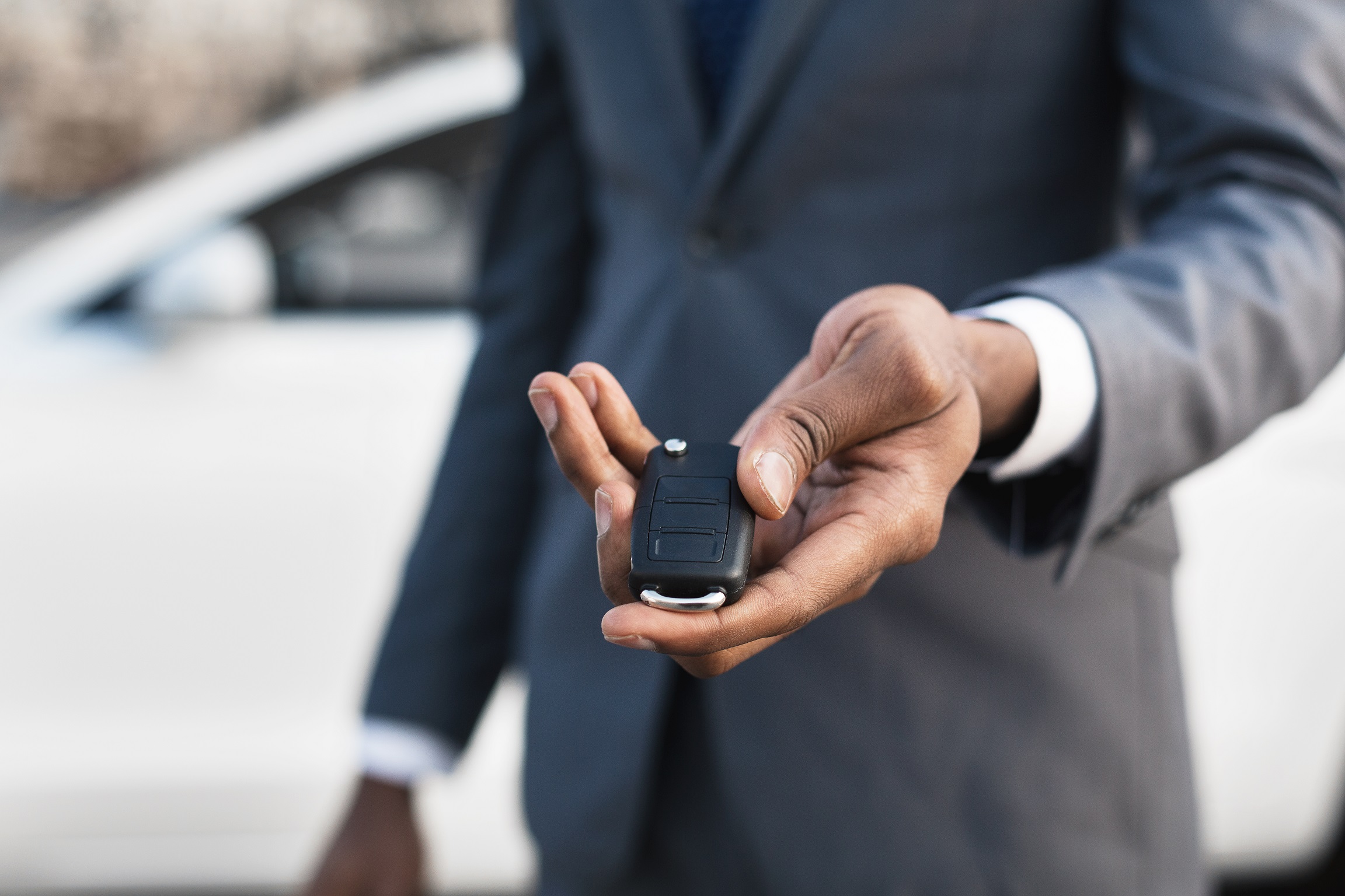 Car sale concept. Man in suit giving car key, focus on hand