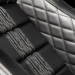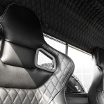 Nu încape nicio îndoială că ceea ce vezi aici e o conversie care transformă Defenderul într-o mașină de stradă, iar bena care și așa era subdimensionată trebuie să împartă spațiul cu o roată de rezervă. Interiorul nu e nici el tocmai utilitar, având piele cusută în romburi inclusiv pe plafon și scaune sport.