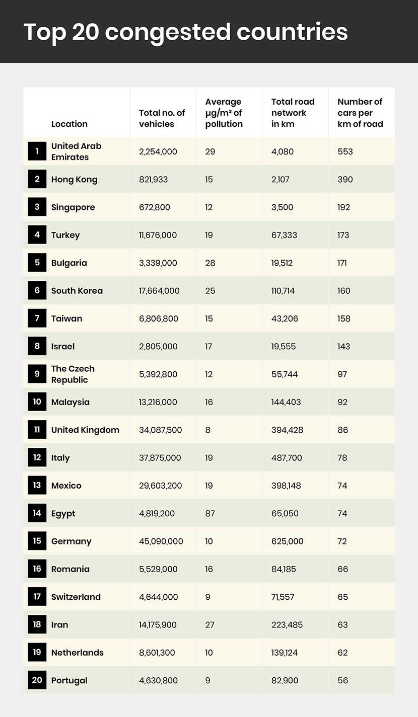 Topul ăsta e, cu adevărat, interesant. În esență, e o analiză care raportează numărul mașinilor înmatriculate în fiecare țară, la numărul de kilometri de șosea disponibili în țara respectivă. România se află pe locul 16. Ce țări au, deci, cele mai aglomerate străzi?