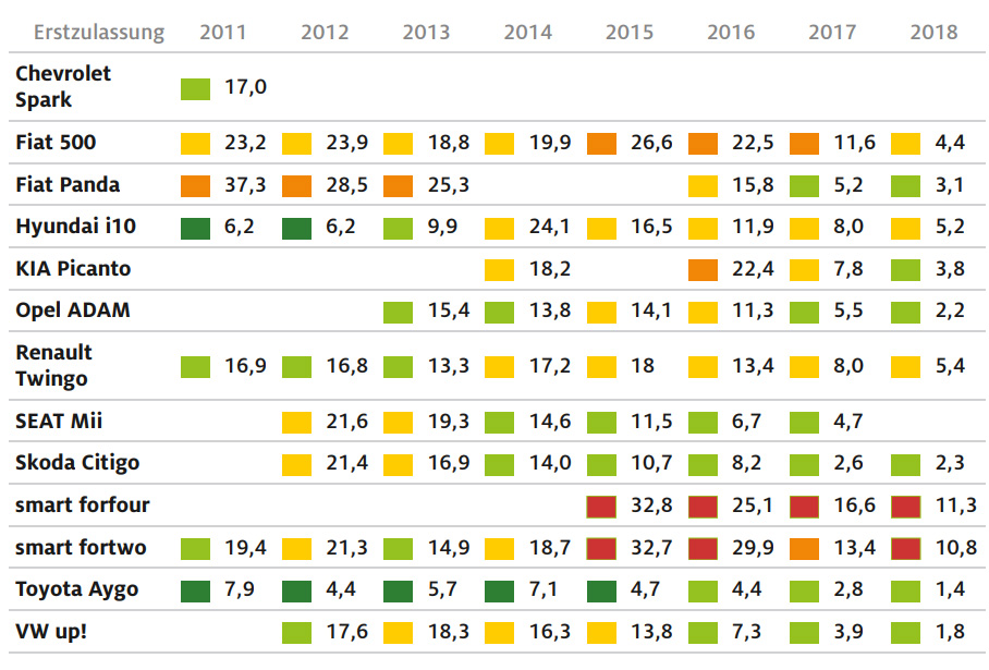La celălalt pol al clasamentului, cel mai puțin fiabil model s-a dovedit a fi smart forfour, a cărui fiabilitate s-a situat permanent ”pe roșu”. Au fost centralizate rezultatele din 2015 până în 2018, adică în perioada în care neamțul a fost un Renault Twingo rebranduit. Surprinzător, Twingo s-a descurcat mult mai bine, cu frecvența defecțiunilor redusă cam la jumătate față de forfour.