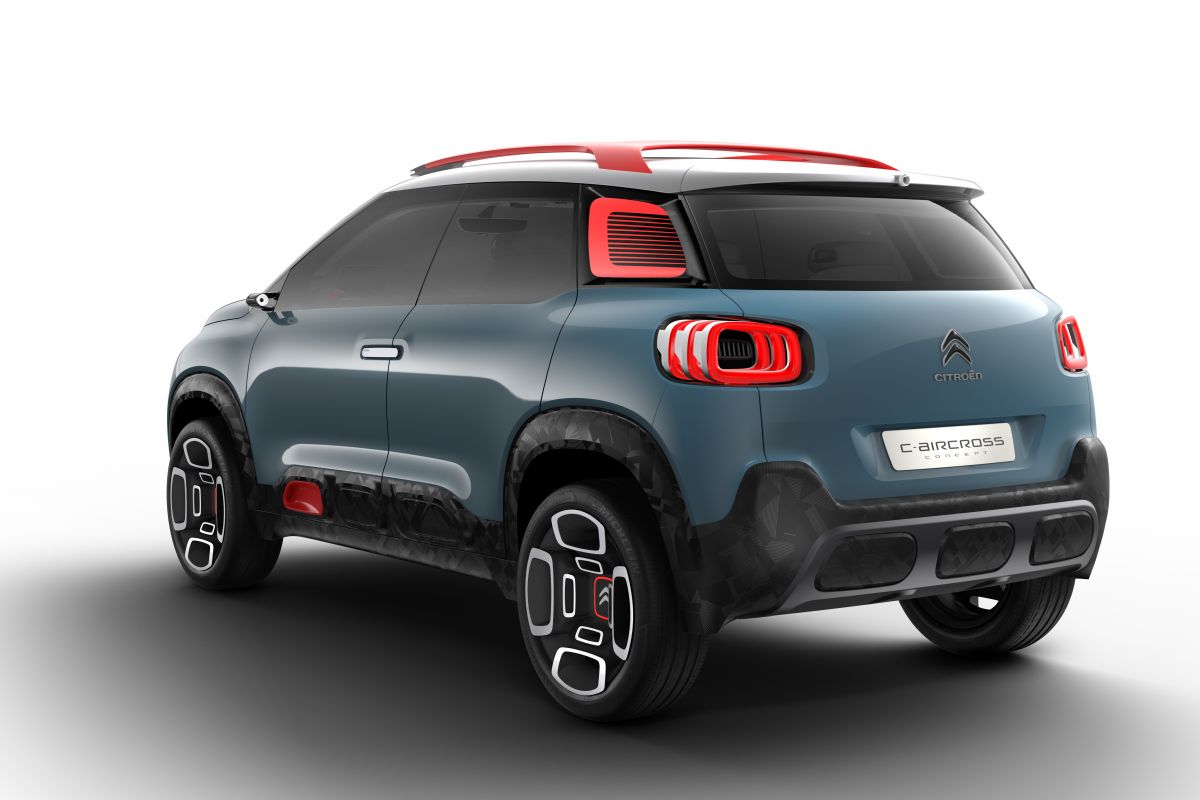 Conceptul care va fi expus la Geneva, în martie, are dimensiuni tipice de segment B: 4,15 m lungime, 1,74 m lățime, 1,63 m înălțime. Relația cu Citroen C3 este trădată de liniile de design similare, cu o parte frontală frapantă prin blocurile optice filigranate și o caroserie dominată de rotunjimi ample. Detalii precum bandourile Airbump, barele de amarare de pe plafon și ornamentele exterioare vopsite în roșu îi conferă lui C-Aircross o tentă ludică.