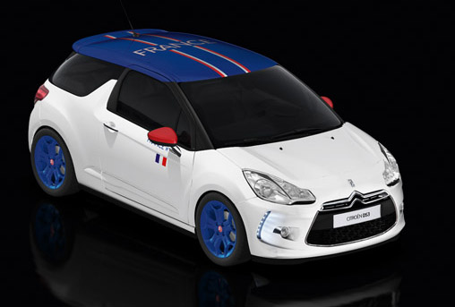 Alb cu plafon albastru, DS3-ul ce poarta culorile Frantei isi etaleaza cu mandrie jantele albastre, retrovizoarele rosii si banda laterala alba. Plafonul arboreaza numele Frantei si linii albe si rosii. Amintind de titlul de Campioni Mondiali, o stea similara celei de pe tricourile jucatorilor echipei Frantei orneaza portierele DS3.
