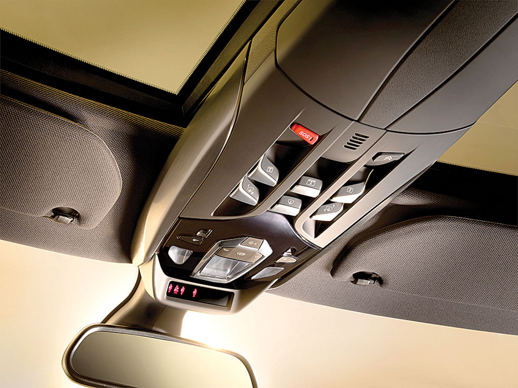 Același gen de butoane tronează și pe tavan, în prelungirea suportului oglinzii retrovizoare, de acolo acționându-se funcțiile sistemului head up display și ale trapelor. Se pare că designerul de interior urăște butoanele pe uși, pentru că a ascuns în spatele volanului comenzile pentru reglarea oglinzilor (am avut nevoie de ceva timp pentru a le depista). Surprinde lipsa spațiilor de depozitare din jurul șoferului, sacrificate în scopul designului.