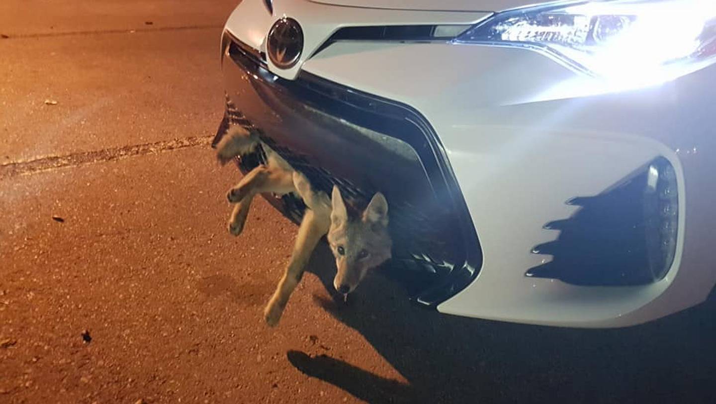 Un toiot lovit de o Toyota. Un coiot lovit de o Coyota. Un coiot lovit de o Toyota. Gata, am nimerit-o. Ei bine, oricât de rău sună, povestea are un final fericit, pentru că animalul, prizonier în grila mașinii, a plecat pe picioarele sale odată ce a fost eliberat.
