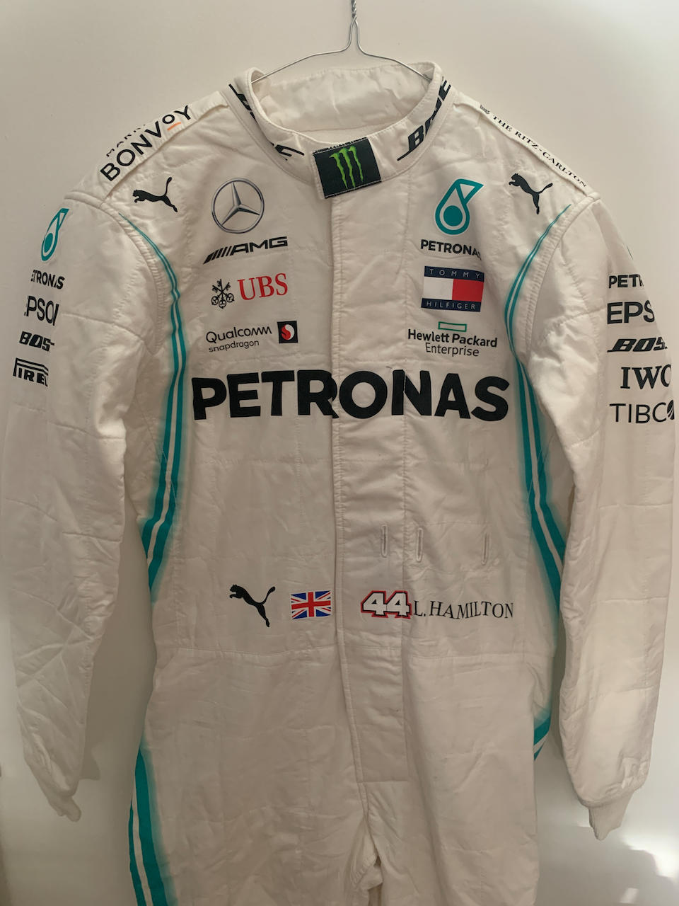 Combinezonul lui Lewis Hamilton a fost donat de echipa Mercedes-AMG Petronas F1. Acesta are numărul 23 (seria Nr. 00160547) și a fost purtat în sezonul 2019 în care Hamilton a obținut al șaselea titlu de campion mondial în sesiunile de calificări din 2019 la Monte Carlo, Austria și Silverstone