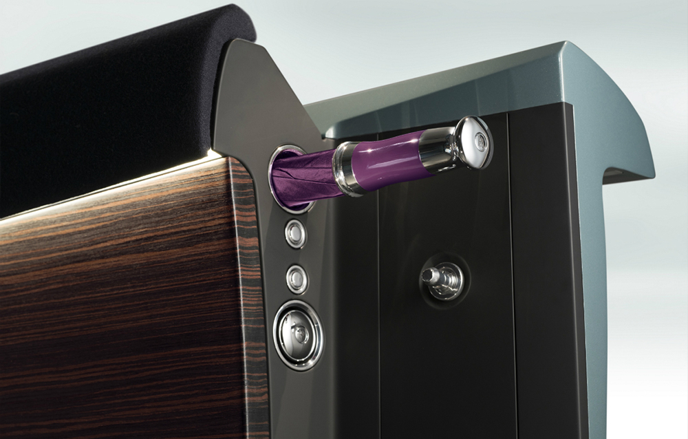 Totuși, punțile dintre trecut și viitor, prezente în cazul conceptului, sunt ceasul analogic plasat în mijlocul tabloului de bord și umbrelele găzduite de masivele portiere. Habitaclul încetează să mai semene cu un interior convențional de mașină, transformându-se într-un salon fin, garnisit cu piele nobilă, lemn de Makassar și mătase împletită.