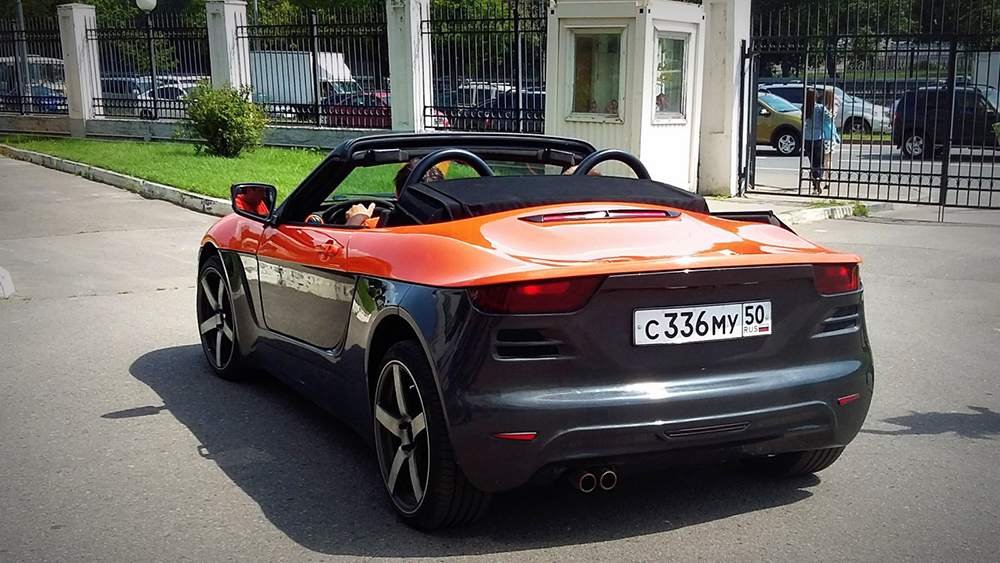 Chiar și șasiul este de concepție proprie, fiind confecționat din profile rectangulare și păstrând proporțiile tipice unui roadster sau, altfel spus, păstrând dimensiunile exterioare ale unei Mazda MX-5. Trebuie să recunoaștem că n-arată rău, mai ales că este pusă în evidență de roțile supradimensionate și de combinația exterioară negru – portocaliu. Cromatica se menține și în cockpit, unde cea mai mare parte a suprafețelor este acoperită cu alcantara. Airbag-uri? Nu, mulțumim! Vorbim despre o mașină rusească, de de unde airbag-uri? Motor, în schimb, are. Dar nu unul performant, ci unul solid: 1,6 litri, 105 CP.