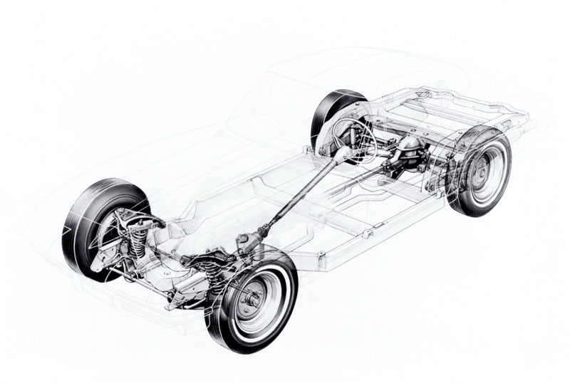 Lansarea C2 (a doua generaţie a modelului Corvette) în 1963 a adus un cadru cu o structură robustă, tip scară, mai rigid cu 90% decât cadrul în formă de X al modelelor din prima generaţie, creat pe baza variantelor sedan. Suspensia spate independentă era fixată cu ajutorul unei structuri unice cu arcuri lamelare transversale. Pe lângă faptul că oferea manevrabilitate sporită, puntea spate independentă era mai uşoară decât cea anterioară, rigidă.