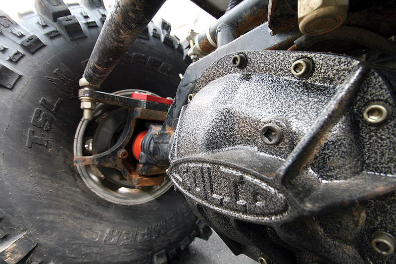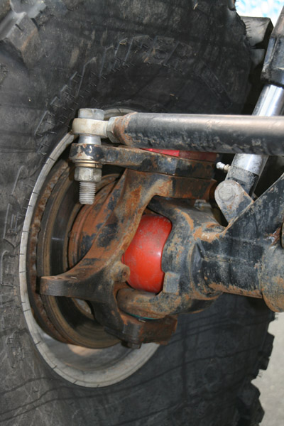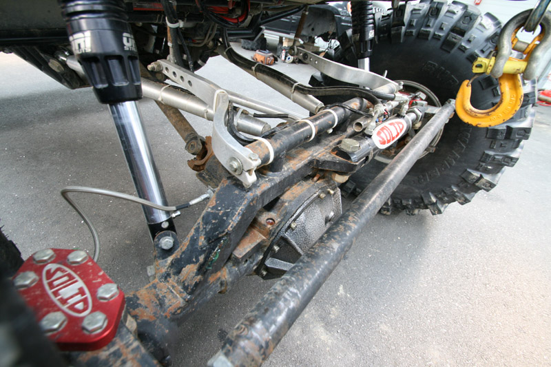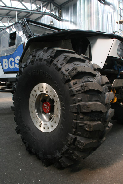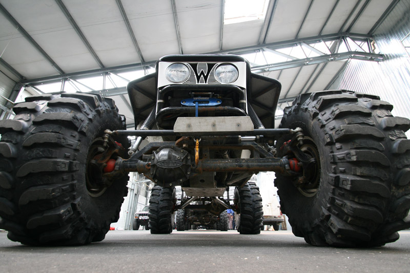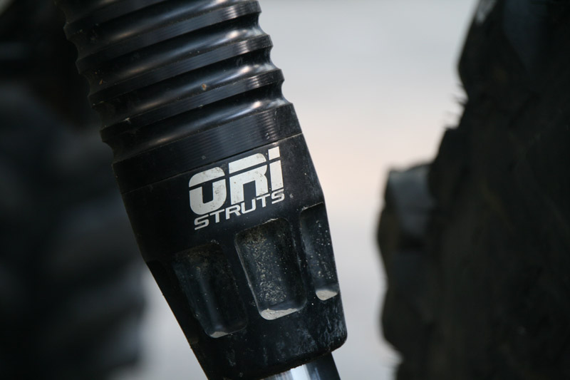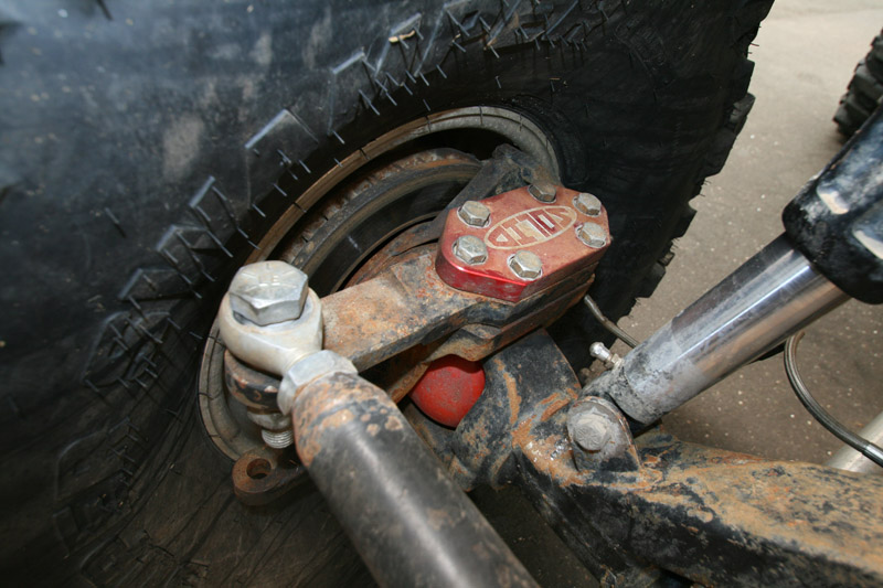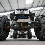 Anvelopele Interco sunt de tip Bogger și au fost modificate pentru a fi și mai agresive, iar dimesiunea lor sunt diametrul de 45 inch și lățimea de 19 inch. Roțile sunt echipate cu sistem beadlock, care le permită să ruleze cu presiuni foarte mici în anvelope, la nevoie chiar 0,5 atm. Suspensia este de tipul four-link și este echipată cu amortizoare heavy-duty ORI, iar de ceea ce este în stare să facă, vedeți deja în foto.