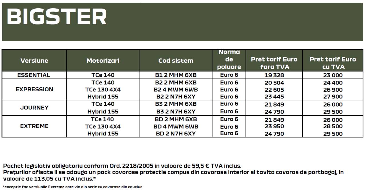Prezentat în premieră mondială în octombrie 2024, la Salonul Auto de la Paris, modelul Dacia Bigster poate fi comandat în România începând cu data de 9 ianuarie 2025. Modelul este disponibil începând de la 23.000 euro (TVA inclusă) pentru versiunea Essential, preț care ajunge la 29.500 euro (TVA inclusă) pentru versiunea de top, Journey Hybrid 155.