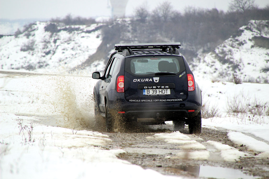 Cum nivelul aptitudinilor în teren este dat în mare măsură de anvelope, pe acest Duster au fost montate jante din tablă cu diametru mai mic, respectiv de 15 inch şi anvelope cu profil agresiv, configuraţie în care am putut savura din plin câteva gropi cu noroaie interesante.