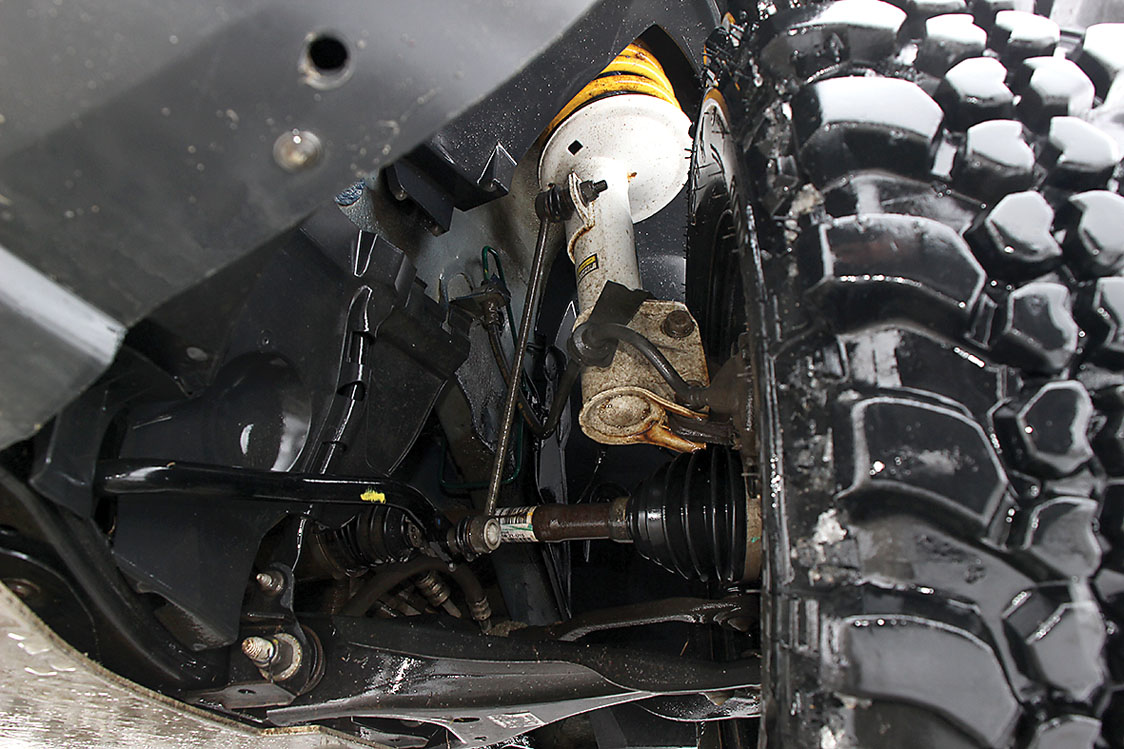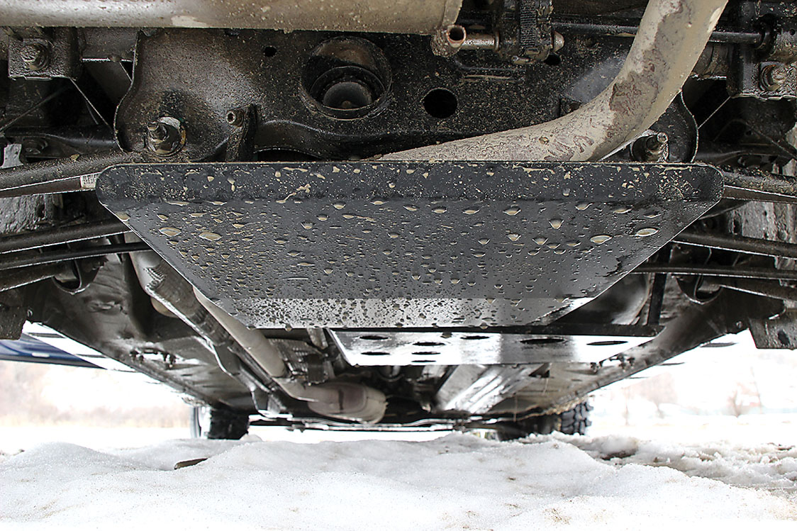 Primele modificări au vizat protejarea componentelor vitale, precum diferenţialul spate şi rezervorul, care au primit scuturi din oţel de 3 mm, sau partea din faţă, ce a primit un scut din aluminiu pentru protecţia zonei inferioare a radiatorului, a intercoolerului şi a unei părţi a motorului. Am apreciat aici şi faptul că inginerii de la Dacia au prevăzut din start maşina cu un tunel securizat prin care trec conductele de motorină şi cele de frână către spate, dar şi cu lonjeroane suficent de solide şi lungi cât să rigidizeze caroseria şi să protejeze transmisia împreună cu traseul de eşapament la trecerea peste obstacolele mari.