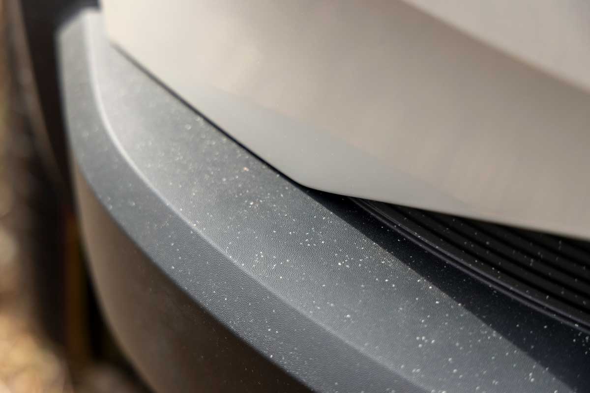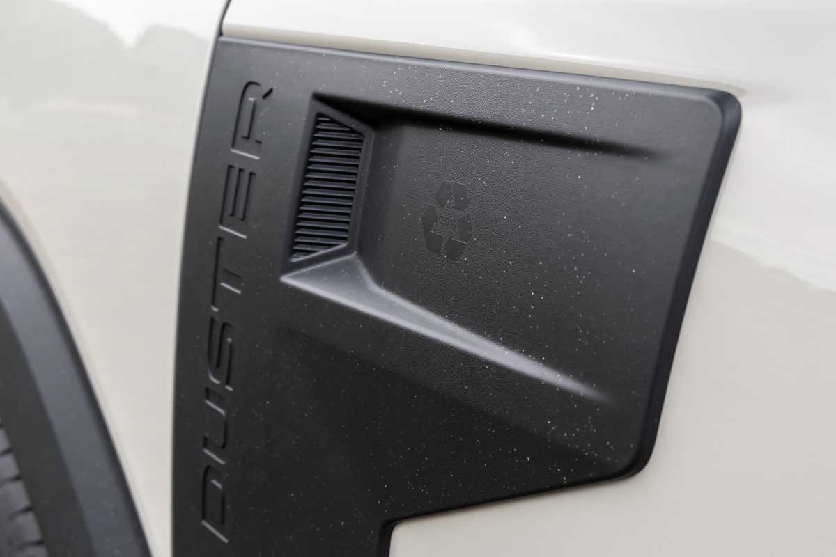 Dacia se mândrește cu asta, așa că nu l-a vopsit, mai ales că și vopseaua poluează, ci i-a lăsat la vedere compoziția pestriță. Astfel, a rezolvat și problema zgârieturilor minore, Starkle fiind mai rezistent decât lacul. Totodată, plasticul folosit la barele de protecție este vopsit în toată masa, nu doar la suprafață, și e negru la versiunea standard și gri la cele superioare. Iar protecțiile de pe aripile din față sunt de-acum integrate mai armonios în caroserie, nu aplicate.