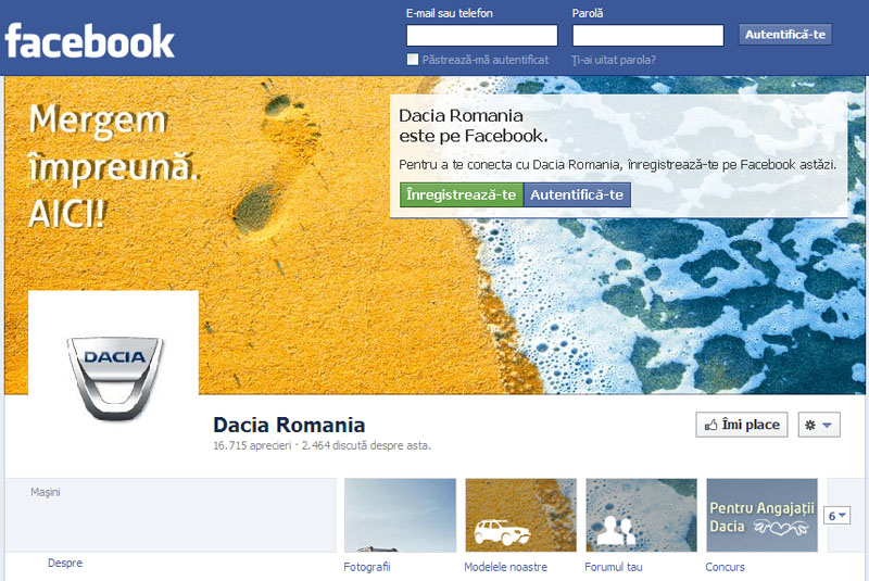 În mai puţin de o lună de la data creării paginii locale Facebook „Dacia România”, peste 16 000 de utilizatori s-au declarat fani ai mărcii româneşti. Dacia a ales să fie prezentă pe platformele de social media pentru a fi mai aproape de clienţii săi, pentru a le asculta opiniile şi a crea un dialog real cu cei interesaţi de brandul şi de produsele sale. Dacia doreşte ca pagina sa de Facebook să contribuie la formarea unei comunităţi în jurul mărcii.