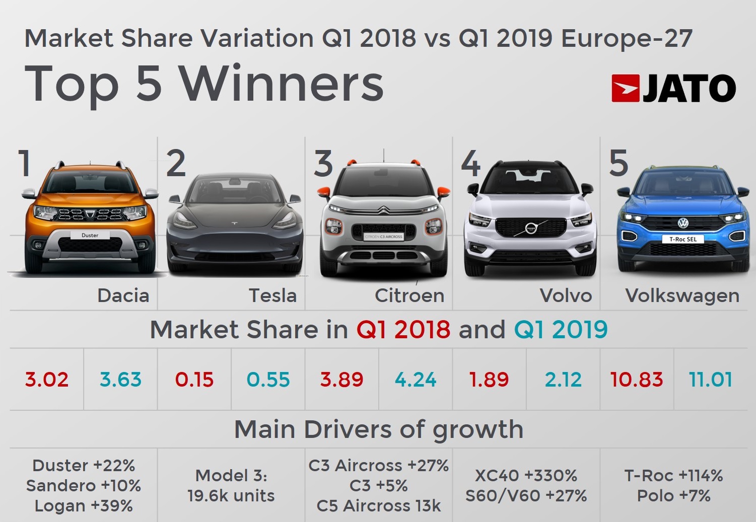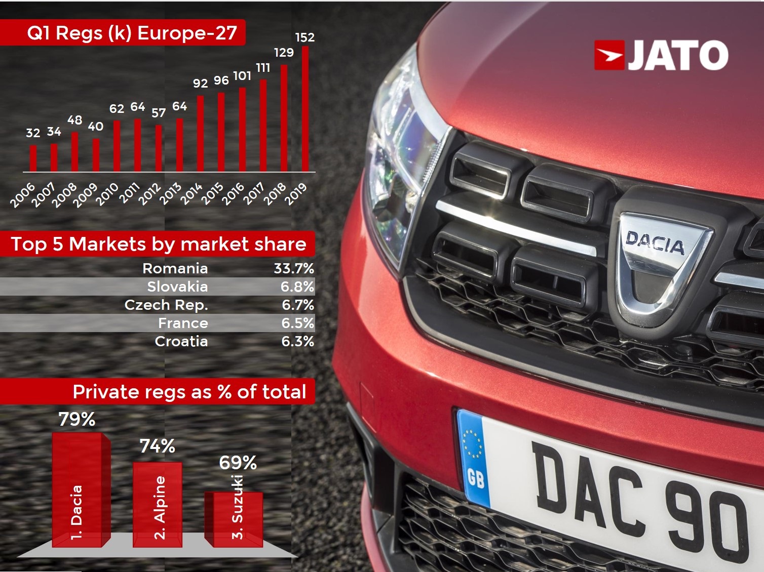 Dacia înregistrează performanțe impresionante în Europa, la 14 ani după ce a trecut sub umbrela Renault. În primele trei luni din 2019, constructorul român a bifat un record al cotei de piață de 3,63%, devenind astfel brand-ul auto cu cea mai mare creștere. Cu 150.000 de mașini vândute anul acesta, Dacia se clasează pe locul 13 în Europa, devansând companii de renume de Nissan, Hyundai sau Kia.